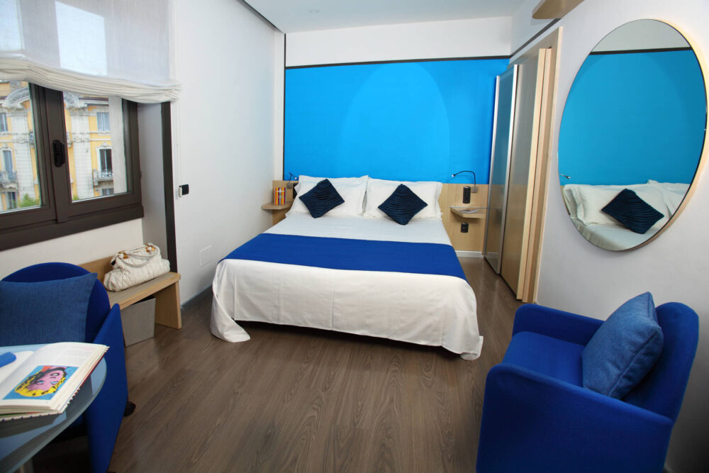 Our double room has been designed to perfectly suit every need, making it the ideal choice for those who want a spacious double room for single use, as well as for those traveling as a couple. The room, furnished with designer furniture and finished with elegant parquet flooring, stands out for its modern style and bright colors. To ensure maximum comfort and flexibility, the room can be configured with a large double bed or two single beds, all in an air-conditioned environment with attention to every detail.
